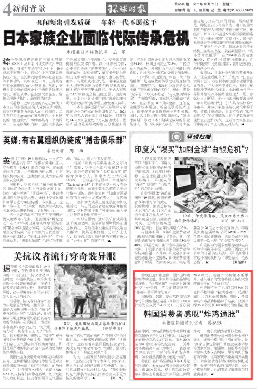 韩联社近日报道称,因韩国炸鸡价格持续上涨,多家炸鸡连锁品牌陆续涨价,“炸鸡通胀”一词登上韩国社交平台热搜。不少消费者感叹,“炸鸡还是平民食品吗?”